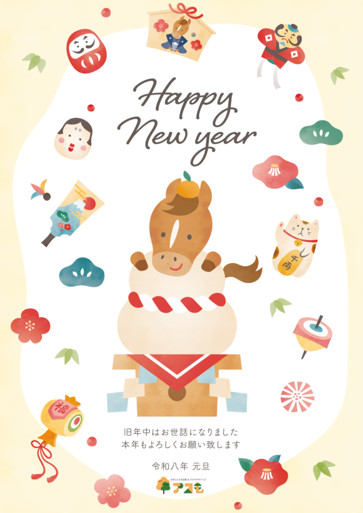 お知らせ情報新年あけましておめでとうございます 2026.01.01新年あけましておめでとうございます旧年中は大変お世話になり、ありがとうございました2026年は1/4(日)より通常営業となります本年もどうぞよろしくお願いいたします2026.1.1 元旦 アスも スタッフ一同 お知らせ一覧に戻る